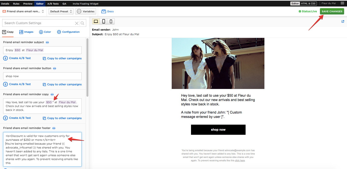 4. You need to update 2 localizations: Friend share email reminder copy (add asterisk to $50) and Friend share email reminder footer (add <b>Discount is valid for new customers only for purchases of $250 or more.</b><br>).