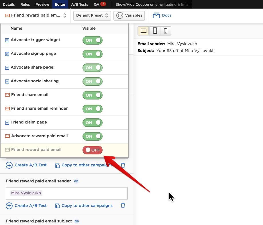 Click on the page switcher and enable the Friend Reward Paid Email by toggling it to “on”.