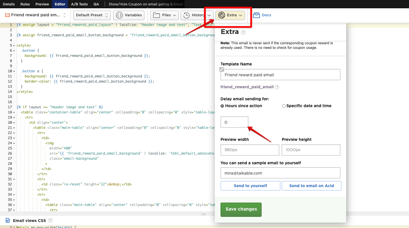 If you’d like to set up a sending delay click ‘Extra’ and set the number of hours for the delay. By default, it is sent right after a friend claims their code.