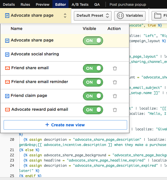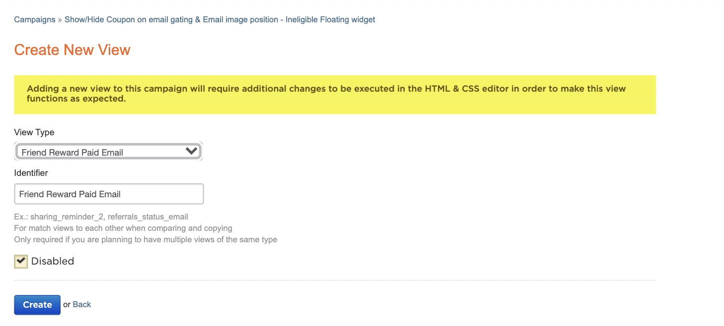 Select ‘Friend reward Paid Email’ as the View Type and click ‘Create’. Note, leave the disabled box checked to prevent the email from sending before it’s properly composed (with copy, images, design). You’ll be able to activate it once everything is set up.